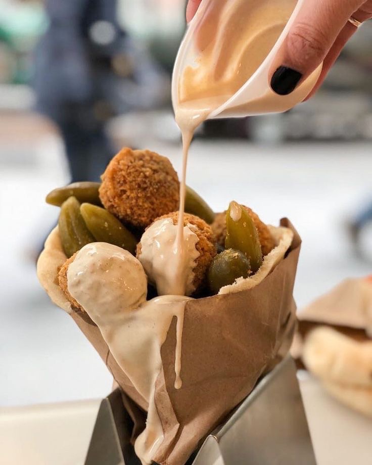 Vor Ort kannst du deine Falafel ganz nach deinem Belieben mit einer großen Auswahl an Toppings und Saucen verfeinern.